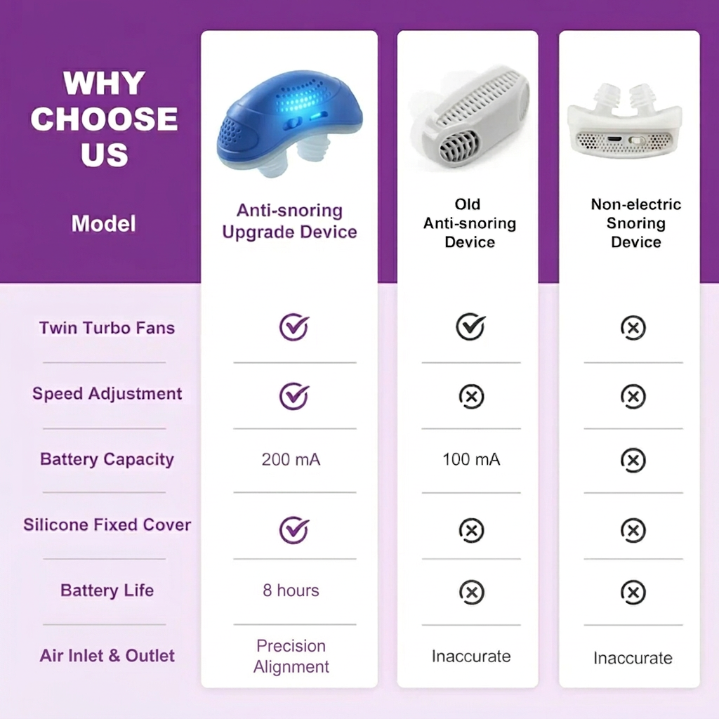 Ons Mini Ademhalingsapparaat helpt je beter te ademen en te stoppen met snurken, op een eenvoudige en natuurlijke manier. Vergeet de onhandige maskers en vervelende slangen. Hoe werkt het? Het is heel eenvoudig: steek het apparaat in je neusgaten voordat je gaat slapen, activeer de stille werking en geniet van een ononderbroken slaap.