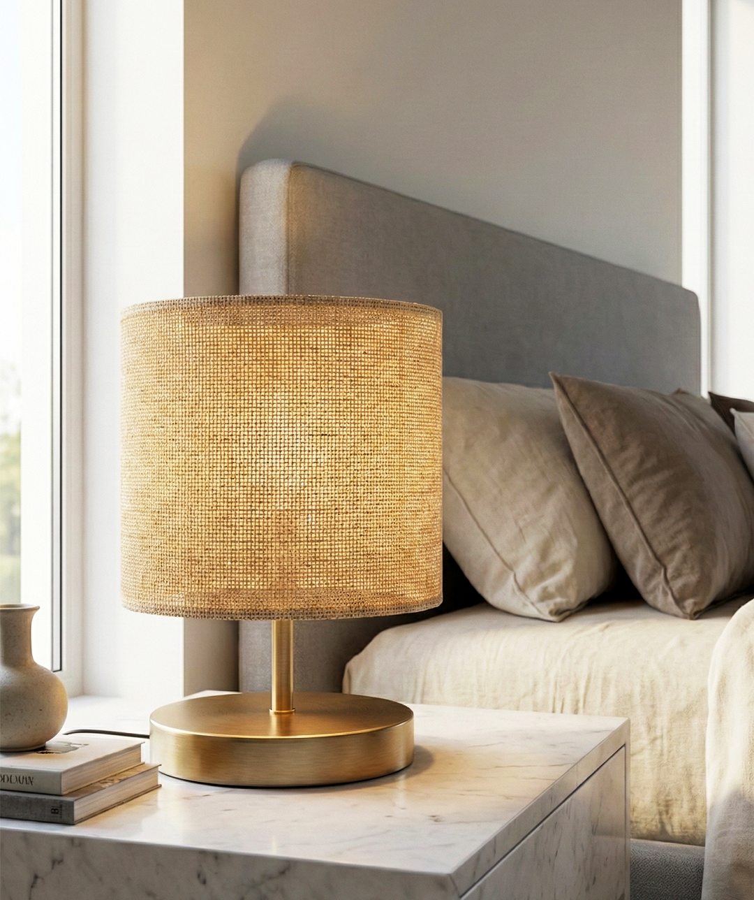 La lampada da tavolo Enrico presenta una base compatta in metallo con finitura in ottone, abbinata a un paralume cilindrico in tessuto naturale a trama visibile. Progettata per offrire una luce calda e diffusa, è adatta a camere da letto, soggiorni e spazi di relax. Le proporzioni contenute e i materiali neutri la rendono facile da integrare in diversi stili d’arredo.